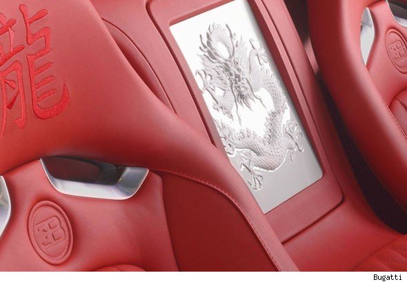 But the highlight, according to Bugatti, is the porcelain dragon ‘centrepiece’ (above) – a plate embedded in the leather between the two seats.