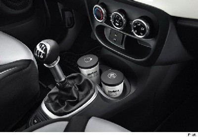 The next version of the Fiat 500, the 500L due in 2013, will have an optional built-in espresso maker developed with Lavazza. The clever little gadget uses capsules, as per George Clooney’s rival coffee brand, but modified slightly to make it more ergonomic to use in the car. We particularly like the little speedometer-style temperature gauge – useless, but sooo cute. The “coffee experience” kit will also include a spoon holder, pod holder and sugar holder. It is a fantastically neat installation, with no visible cables – the machine clips directly into the power source between the seats.
