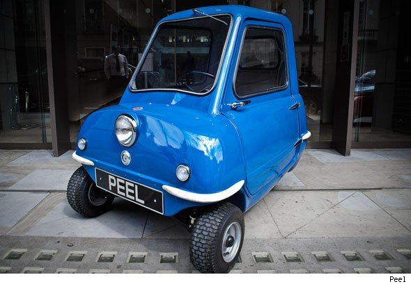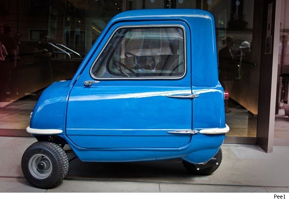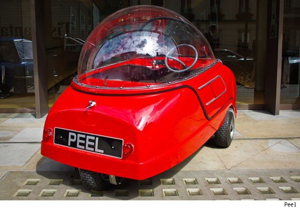 The Peel P50 was originally made in the Isle of Man between 1962 and 1965, costing two hundred quid and coming with such luxuries as a single headlamp, a windscreen wiper and space for ‘a single adult and a shopping bag’. But no way of reversing. Peel went bust in 1974.